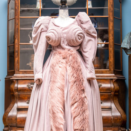 "Agafia" jest to suknia wykonana na podstawie rysunku kostiumu autorstwa Jerzego Skarżyńskiego do spektaklu "Ożenek", który nie został nigdy zrealizowany. Można znaleźć interesujące powiązania między akcją sztuki Mikołaja Gogola a projektem zwłaszcza w kontekście postaci Agafii Tichonownej. Czy Agafia mogłaby "zrekonstruować" siebie? Agafia to kobieta rozpięta między własnymi pragnieniami a presją społeczną, by wyjść za mąż. Jest niepewna, bierna, nie potrafi podjąć decyzji (czeka, aż ktoś zdecyduje za nią) -w dużej mierze dlatego, że jest zakładniczką tradycyjnych ról kobiecych, narzuconych przez patriarchalny świat. Przesadnie rozbudowane rękawy i spiralne biustonosze przypominają ciężar konwenansów, które ograniczają kobietę. Futro ułożone w kształt waginalny można interpretować jako element cielesności i kobiecej seksualności, a poprzez organiczne, cielesne formy, suknia ujawnia kobiecość w sposób, który burzy wyidealizowany obraz "panny na wydaniu".
